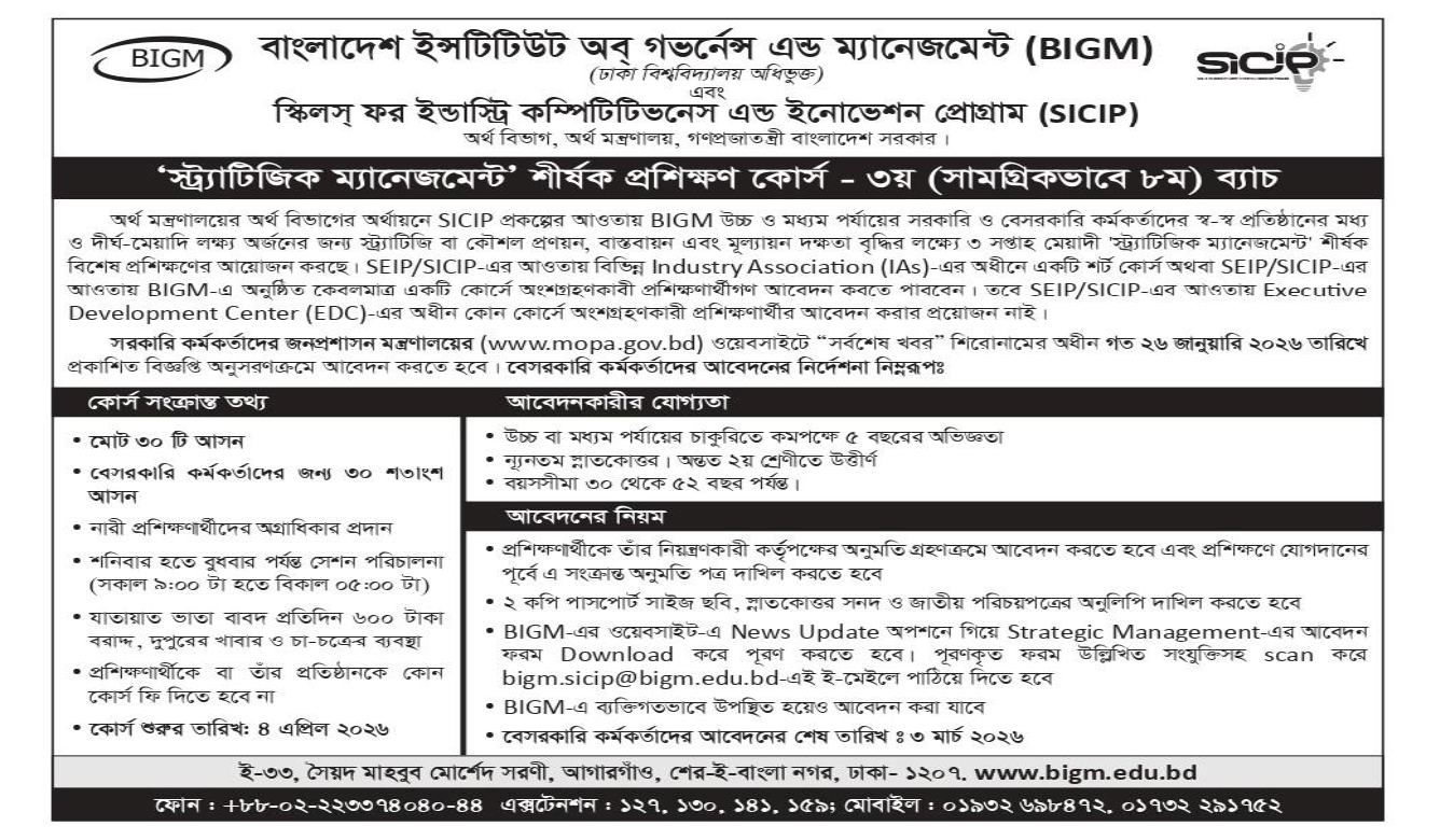 Bangladesh Institute of Governance and Management (BIGM), formerly known as Civil Service College, Dhaka, a post-graduate institution affiliated to the University Of Dhaka, has been established with the objective of creating a centre of excellence for studies and research on public policy and management, and promotion of good governance in the country. Registered under the Trust Act, 1882 as a nonprofit organization and provides opportunities for higher studies at a subsidized tuition fee. The Institute was established in 2006 and currently 11th and 12th batches are studying. At present, it offers Masters in Public Affairs in (i) Governance and Public Policy (GPP), (ii) International Economic Relations (IER) and (iii) Human Resource Management (HRM). The Institute plans to expand its academic Programme by incorporating Masters in Public Affairs degree in 3 new areas i.e., Project Management, Public and Financial Management, Procurement and Supply Chain Management within coming years. At the beginning, the Institute had been functioning in a rented accommodation in the BIAM Foundation Bhavan at Eskaton. It moved to its own campus at Agargaon in July 2013.