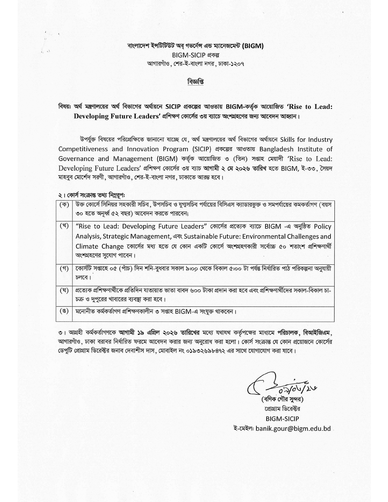 বিষয়: ‘Strategic Management' প্রশিক্ষণ কোর্সের ৩য় ব্যাচে (সামগ্রিকভাবে ৮ম ব্যাচ) কর্মকর্তা/প্রশিক্ষণার্থী নির্বাচন। উপর্যুক্ত বিষয়ের পরিপ্রেক্ষিতে জানানো যাচ্ছে যে, অর্থ মন্ত্রণালয়ের অর্থ বিভাগের অর্থায়নে Skills for Industry Competitiveness and Innovation Program (SICIP) Bangladesh Institute of Governance and Management (BIGM) আগারগাঁও, ঢাকায় ৩ সপ্তাহ মেয়াদি ‘Strategic Management' কোর্সের ৩য় ব্যাচের (সামগ্রিকভাবে ৮ম ব্যাচ) প্রশিক্ষণ আগামী ৪ এপ্রিল ২০২৬ তারিখ হতে অনুষ্ঠিত হবে। উক্ত প্রশিক্ষণ কোর্সে অংশগ্রহণ করার জন্য নিম্নবর্ণিত ৩২ (বত্রিশ) জন কর্মকর্তাকে নির্দেশক্রমে নির্বাচন করা হলো (জ্যেষ্ঠতার ক্রমানুযায়ী নয়)ঃ