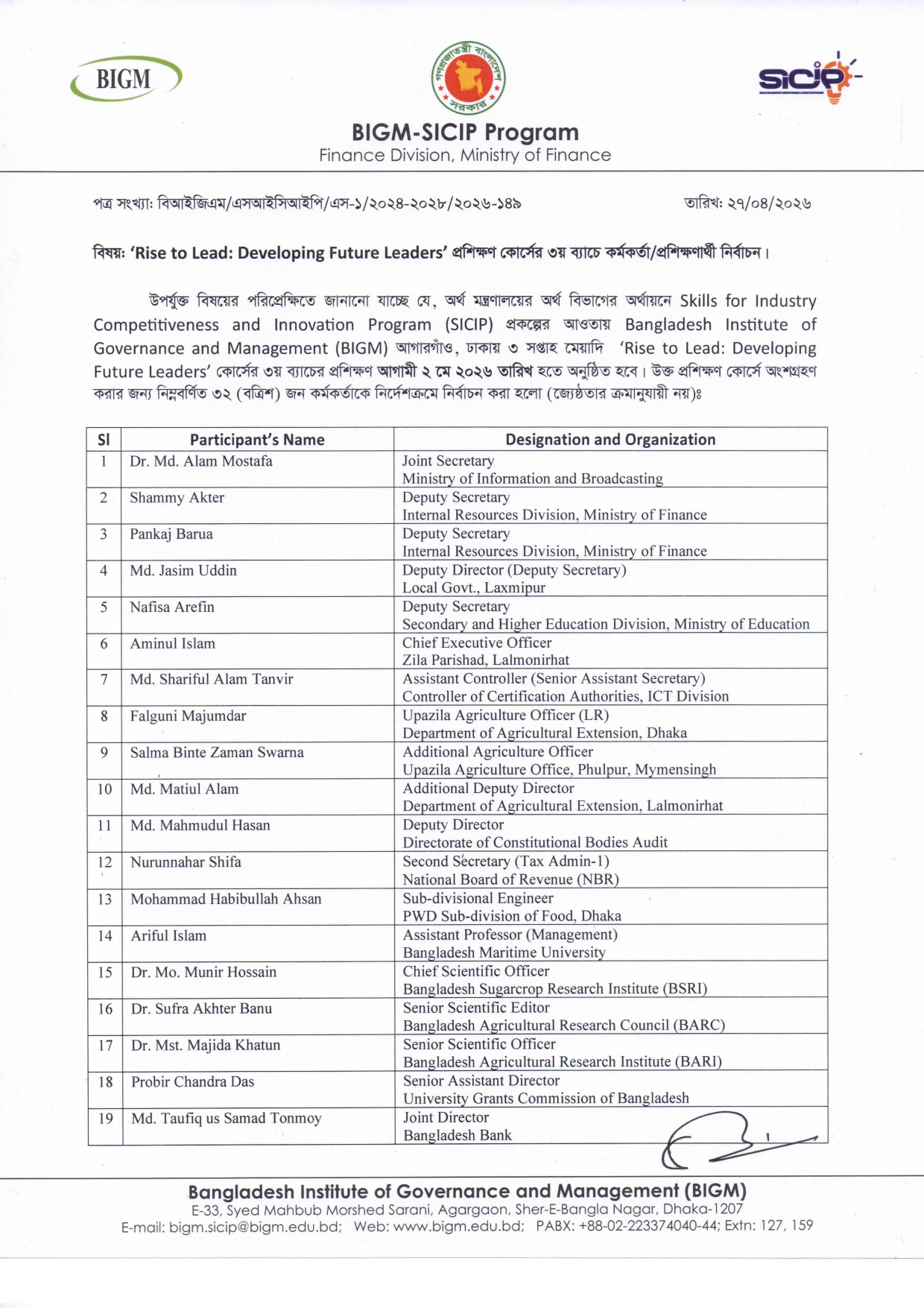 Trainees Admission Circular (Government Officials) of BIGM-SICIP Policy Analysis Course, batch-5 (overall 24)