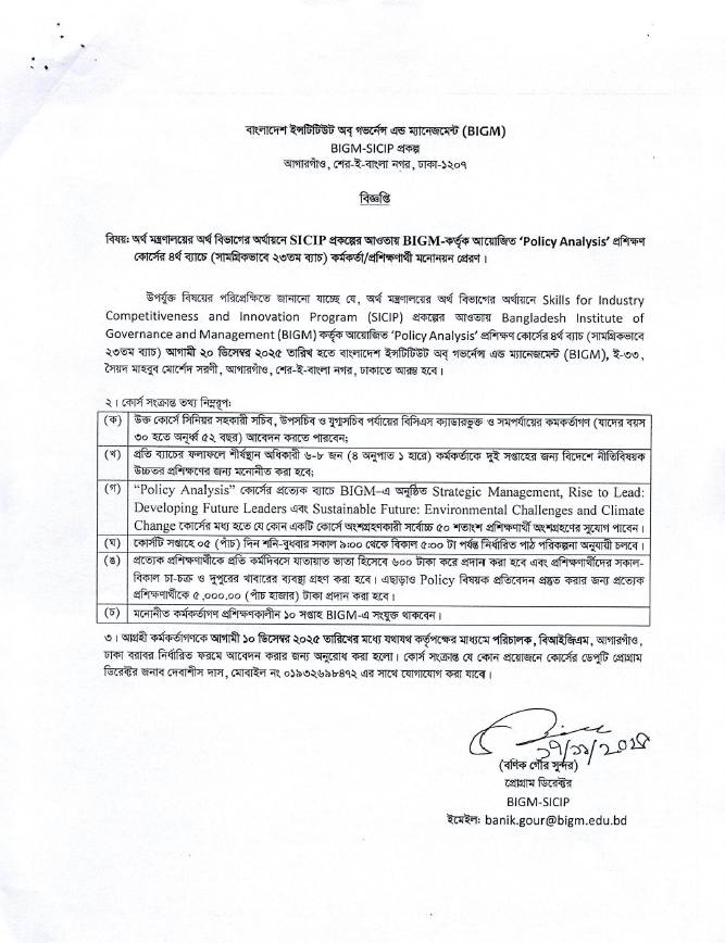 বাংলাদেশ ইনস্টিটিউট অব গভর্নেন্স অ্যান্ড ম্যানেজমেন্ট (BIGM) কর্তৃক আয়োজিত ‘পলিসি এনালাইসিস’ প্রশিক্ষণ কোর্সের ১৭ তম ব্যাচে কর্মকর্তা মনোনয়নের বিজ্ঞপ্তি।