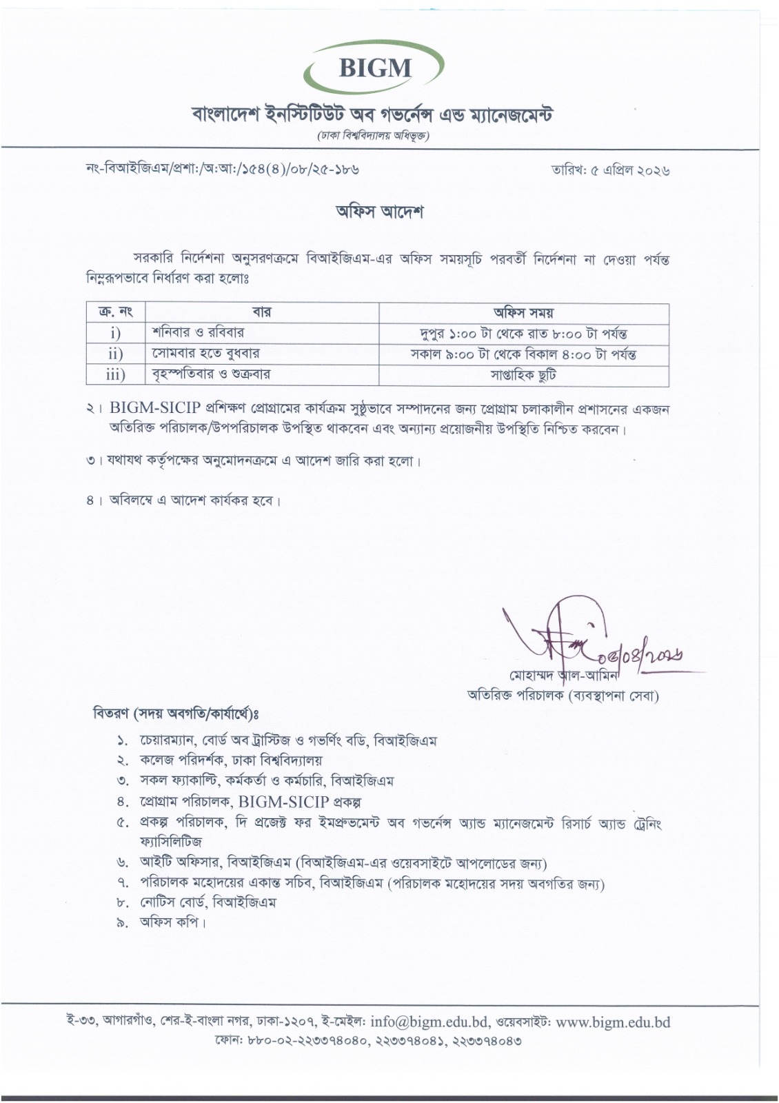 Bangladesh Institute of Governance and Management (BIGM), formerly known as Civil Service College, Dhaka, a post-graduate institution affiliated to the University Of Dhaka, has been established with the objective of creating a centre of excellence for studies and research on public policy and management, and promotion of good governance in the country. Registered under the Trust Act, 1882 as a nonprofit organization and provides opportunities for higher studies at a subsidized tuition fee. The Institute was established in 2006 and currently 11th and 12th batches are studying. At present, it offers Masters in Public Affairs in (i) Governance and Public Policy (GPP), (ii) International Economic Relations (IER) and (iii) Human Resource Management (HRM). The Institute plans to expand its academic Programme by incorporating Masters in Public Affairs degree in 3 new areas i.e., Project Management, Public and Financial Management, Procurement and Supply Chain Management within coming years. At the beginning, the Institute had been functioning in a rented accommodation in the BIAM Foundation Bhavan at Eskaton. It moved to its own campus at Agargaon in July 2013.