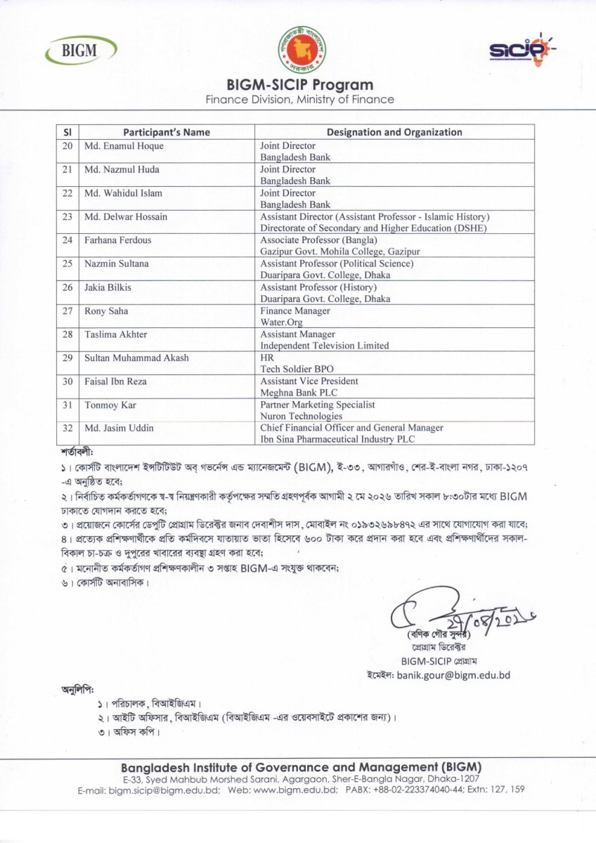 Rise to Lead: Developing Future Leaders প্রশিক্ষণ কোর্সের ৩য় ব্যাচে নির্বাচিত প্রশিক্ষণার্থীদের তালিকা